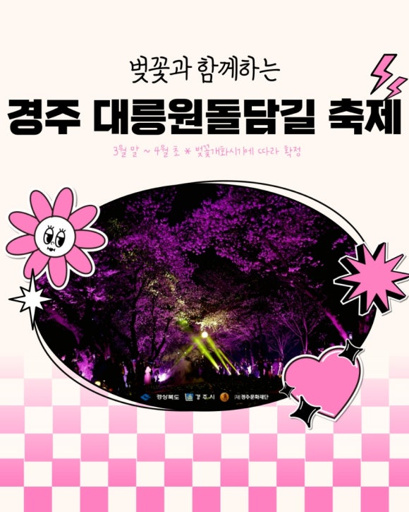 | 경주 대릉원 돌담길 벚꽃축제 | 3월 29일 ~ 3월 31일 | 대릉원 돌담길 | 벚꽃 플로깅, 반려견 체험, 예술 공연 |